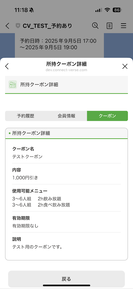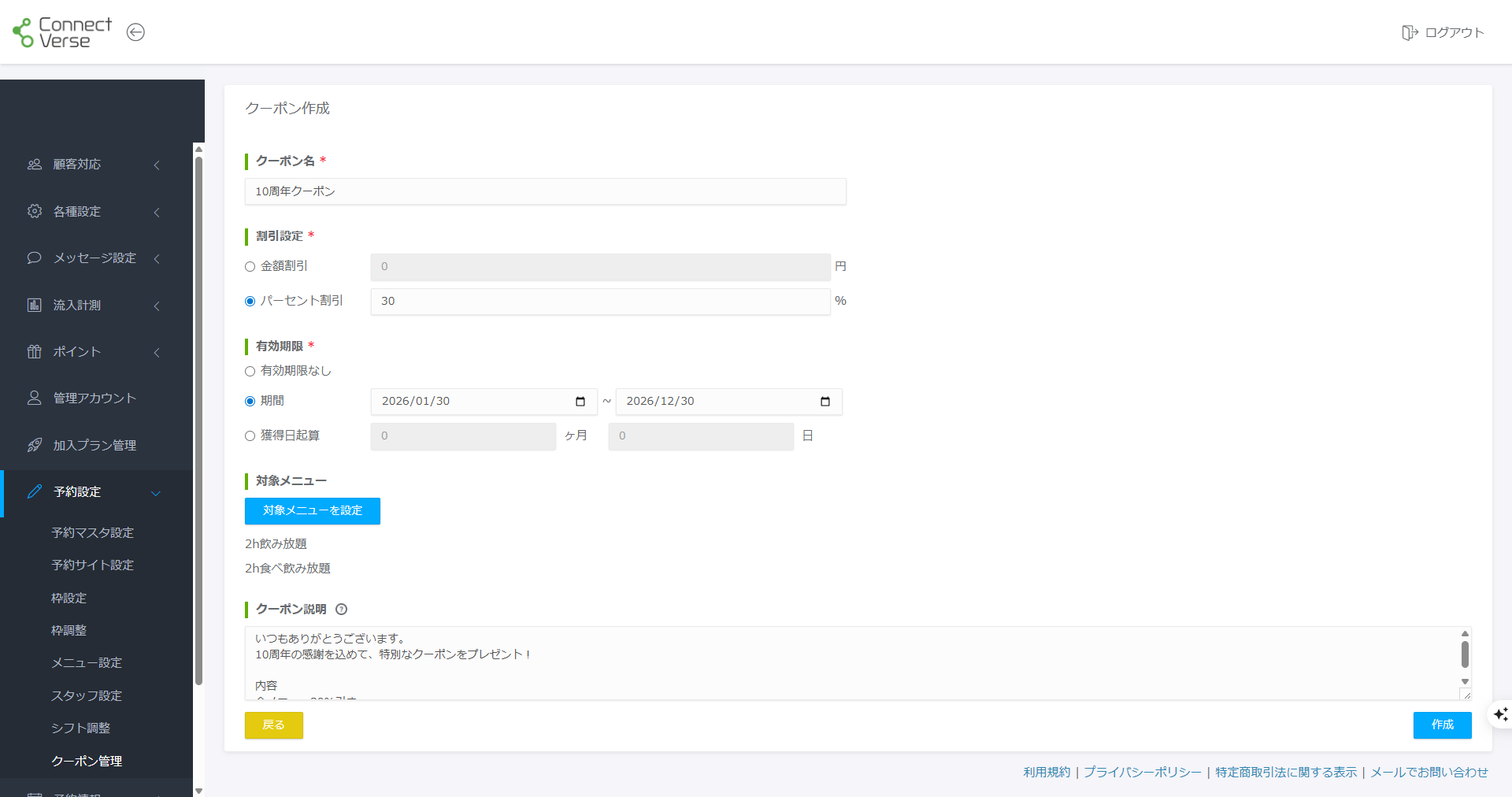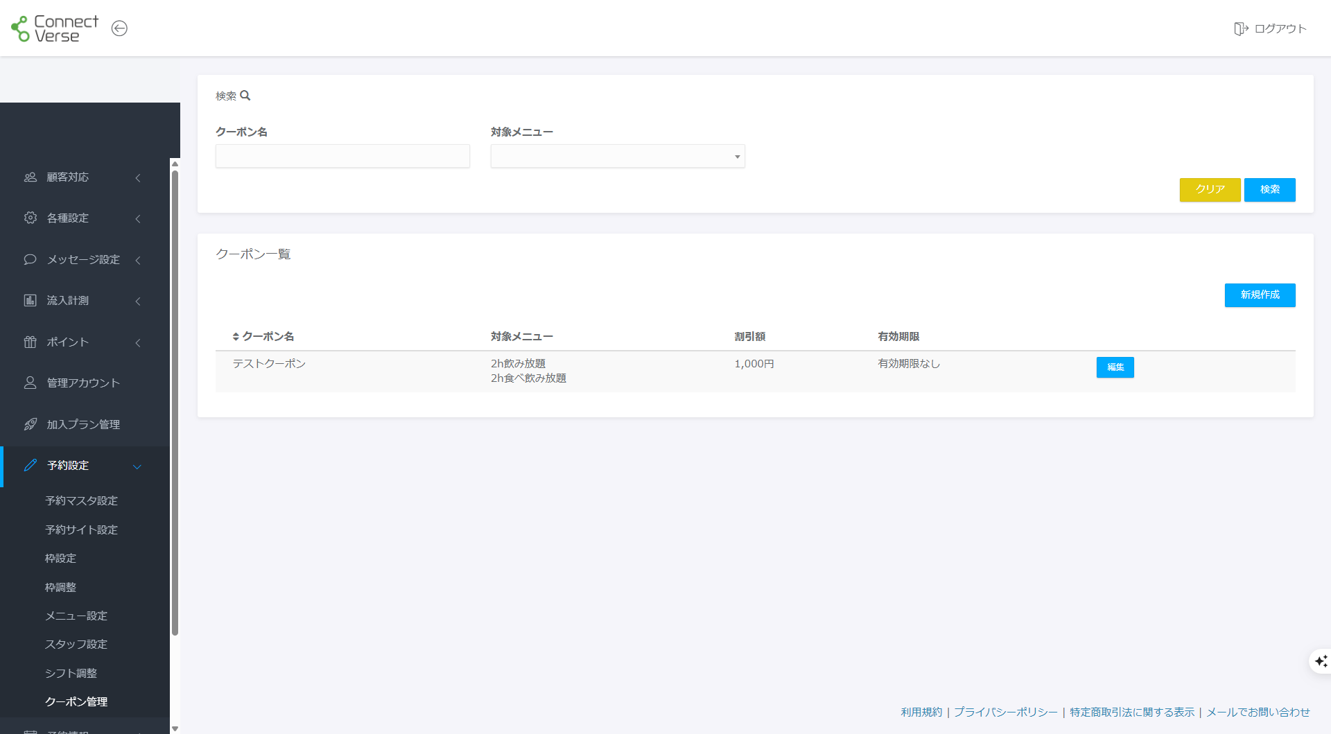 ConnectVerseの予約システムでは、予約時に利用可能なクーポンを発行することができます。