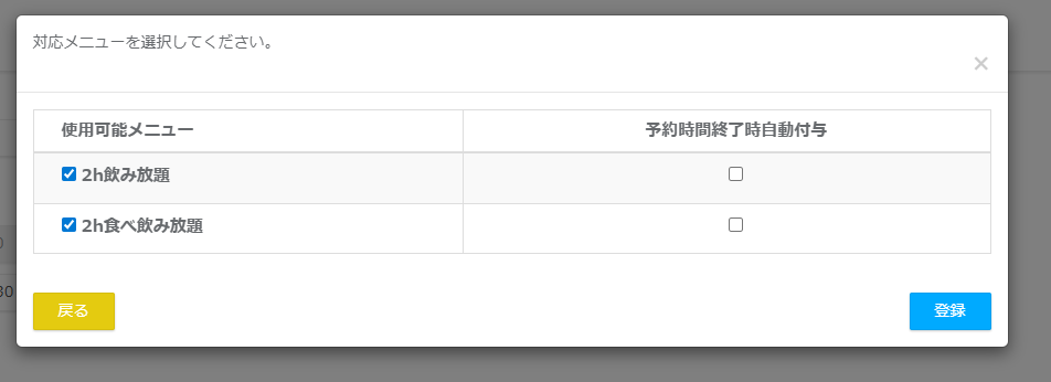 予約時間終了時自動付与 チェックをいれたメニューの予約時間終了時に自動でクーポンをユーザーに付与します。
