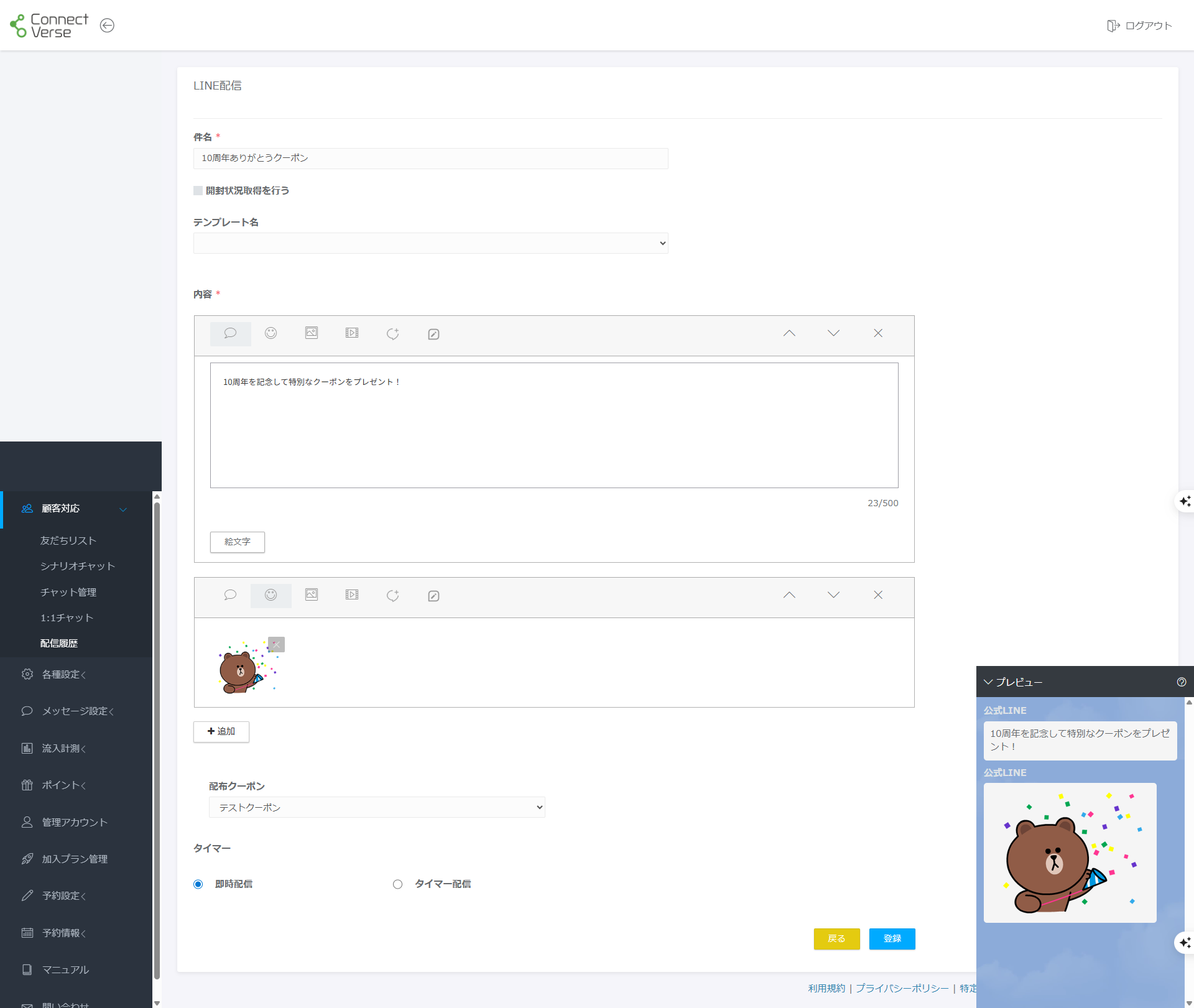 画面右にある「LINE配信」ボタンをクリックしてLINE配信設定画面に遷移します。