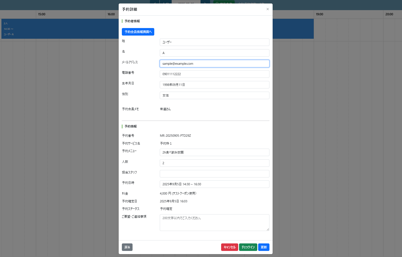 予約詳細モーダルでは予約情報の確認・更新ができます。